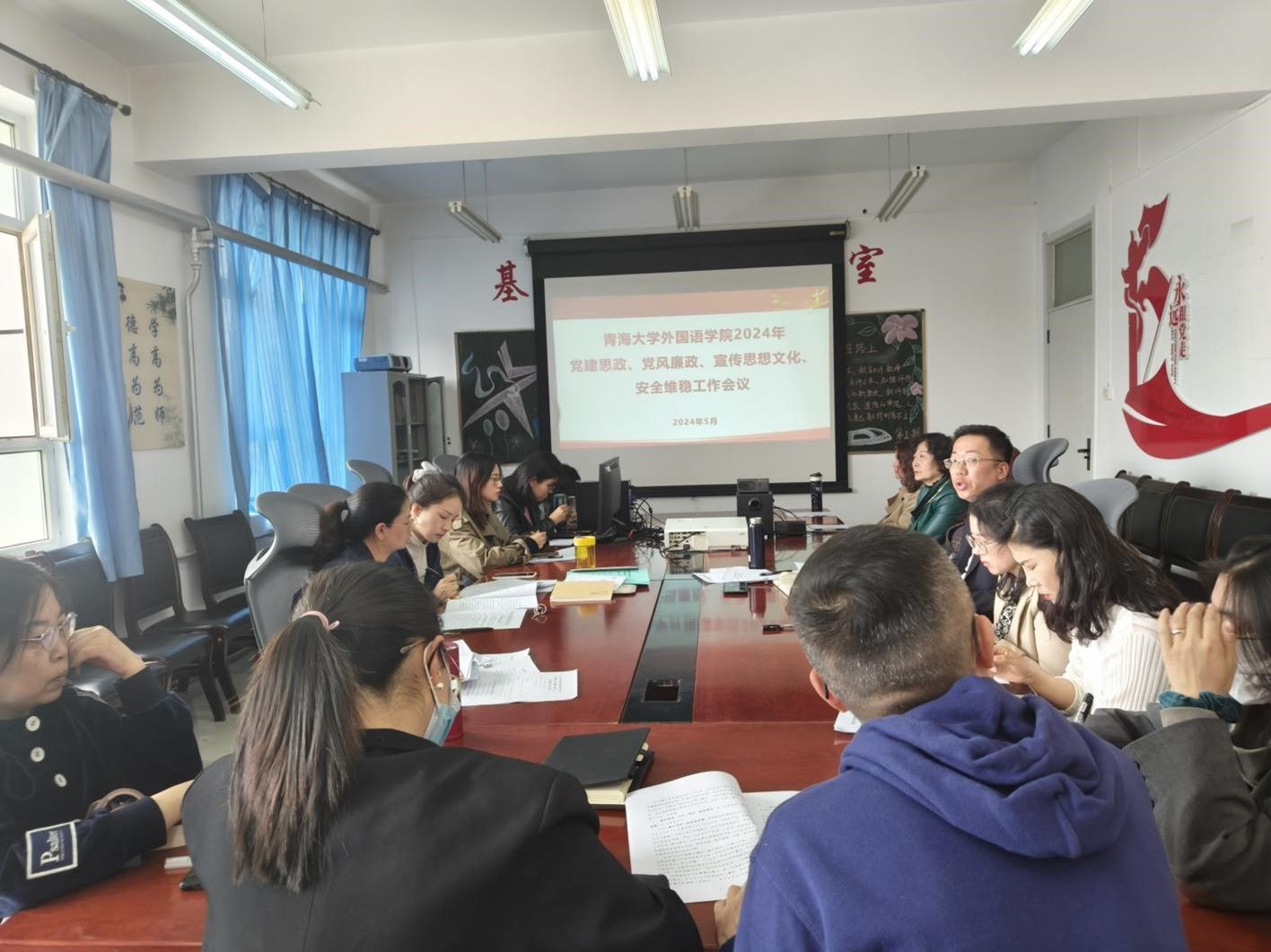 召开2024年党建思政、党风廉政、宣传文化、安全维稳工作会议。会议由学院直属党支部书记黄敏主持。
